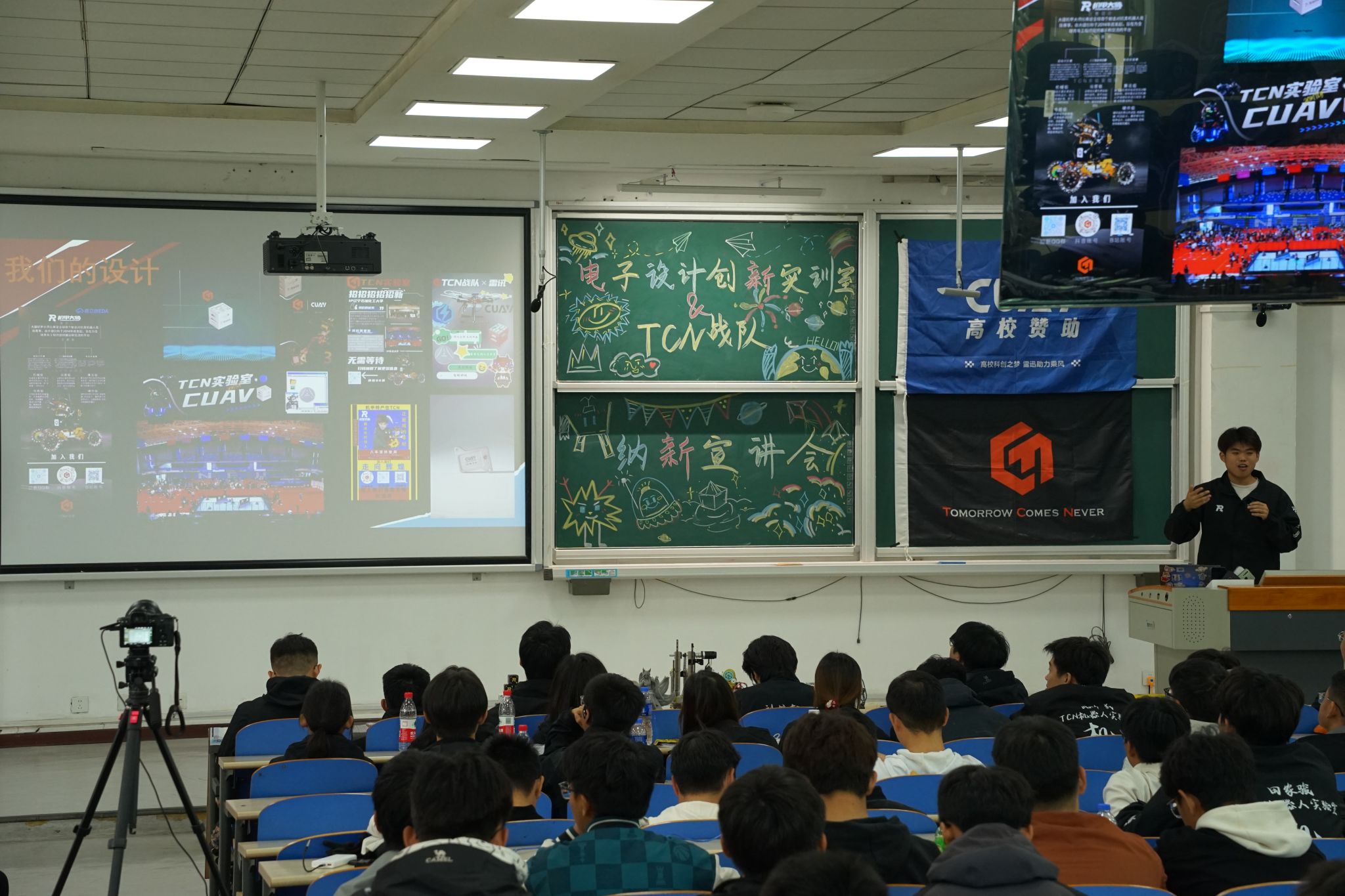 为进一步搭建实践育人平台,10 月 12 日,学院在四教 A202 教室举办机器人与电子设计实训室 & Robomaster 机甲大师 TCN 战队纳新宣讲会。信息与控制工程学院副院长金鑫出席会议,详细介绍实训室功能定位及学院近年来在科技竞赛中的成果,鼓励新生主动投身各类科技竞赛,在实践中锤炼专业技能、激发创新思维;实训室队员就团队组织架构、技术分工及日常运作模式展开细致讲解,并耐心解答新生关于参赛、学习规划的疑问。
